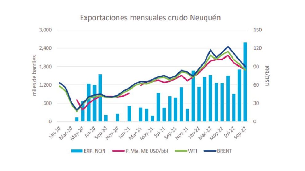 Con respecto al acumulado durante los primeros nueve meses de 2022, las exportaciones de petróleo alcanzaron 13,4 millones de barriles, 18,3% de la producción provincial, lo que representó U$S 1.250 millones.