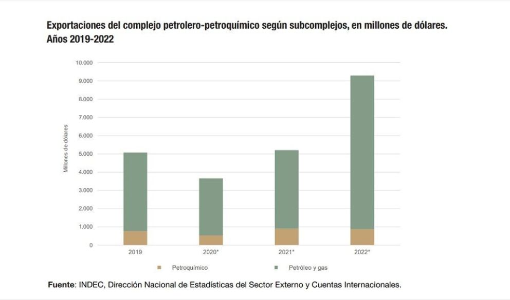 El sector de petróleo y gas y la petroquímica significan el 10,5% de las exportaciones de Argentina en 2022, de acuerdo al informe anual sobre los complejos exportadores del Indec. El total de dólares que generó la industria en toda su cadena fue de 9.297 millones de dólares, un crecimiento del 78,5% en comparación al 2021.