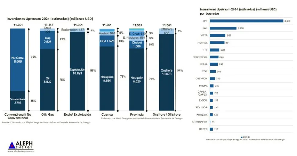 De acuerdo con los datos de Aleph Energy en el año 2023 las inversiones convencionales crecieron un 11% y las no convencionales un 37% respecto del 2022.