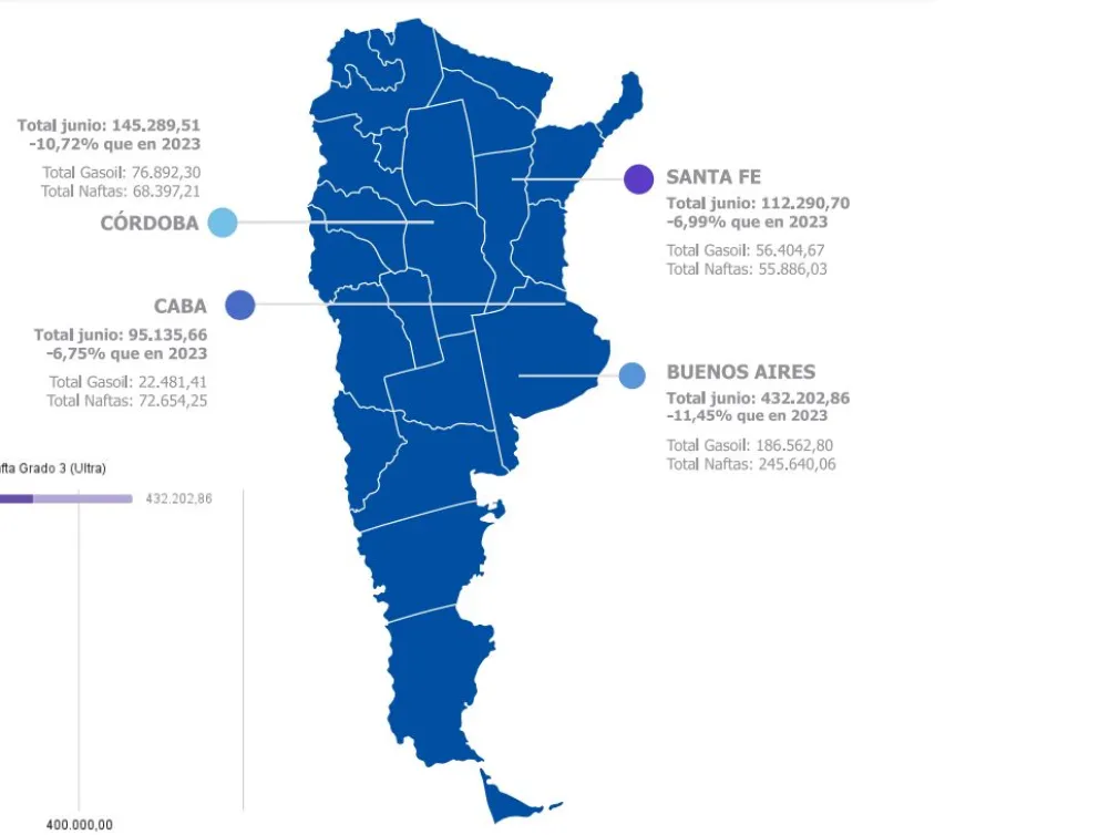 Según informó la Secretaría de Energía de la Nación, el ranking de las provincias que más vendieron combustible en el mes de junio aparecen por orden de importancia: Buenos Aires con 432.202,86 m3; Córdoba 145.289,51 m3; Santa Fe 112.290,70 m3; CABA 95.135,66 m3; Mendoza 62.697,96 m3; Entre Ríos 49.660,42 m3; Tucumán 38.678,79 m3; Río Negro 35.418,90 m3; Misiones 36.652,00 m3; Neuquén 32.221,54 m3; Salta 33.803,89 m3; Catamarca 9.772,99 m3; Chaco 30.295,96 m3; Chubut 26.174,72 m3; Corrientes 28.984,88 m3; Formosa 12.193,00 m3; Jujuy 18.037,88 m3; La Pampa 24.746,72 m3; La Rioja 10.801,02 m3; San Juan 15.989,60 m3; San Luis 16.946,15 m3; Santa Cruz 15.214,00 m3; Santiago del Estero 22.881,38 m3; Tierra del Fuego 7.149,00 m3;