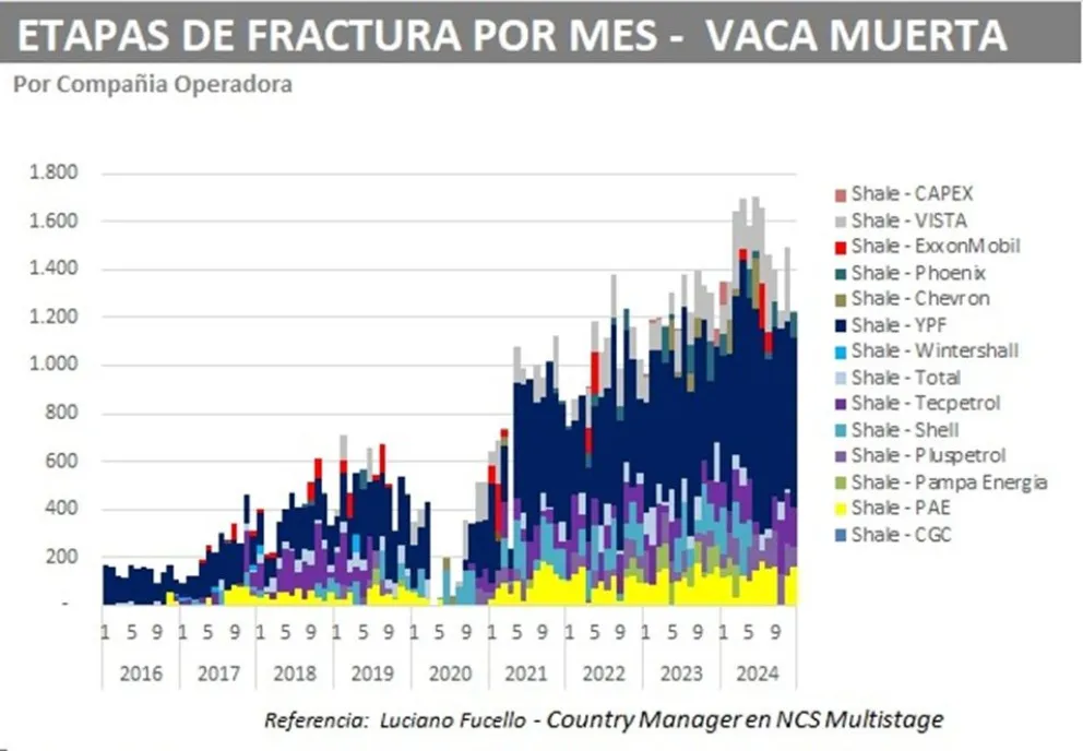 El informe difundido por la Fundación Contactos Energéticos indica que el 2024 cerró con YPF a la cabeza con 8732 etapas de fractura en Vaca Muerta, le siguió VISTA con 2396, luego Tecpetrol con 1453, PAE con 1418, Pluspetrol con 1243, Shell con 681, Phoenix con 473, Chevron con 385, TotalEnergies on 345, ExxonMobil con 318, Pampa Energía con 250 y Capex con 102.