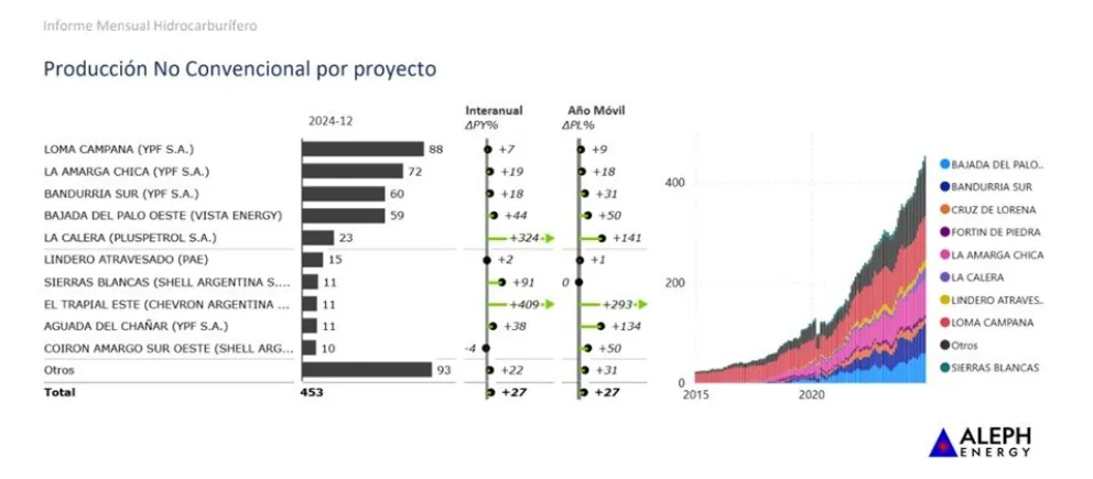 "YPF, como operador, mantiene su liderazgo de producción de petróleo No Convencional, concentrando el 54% de la misma con 238 kbbl/d, un 20% por encima de los valores del último año móvil", subraya Aleph Energy. "Vista es el segundo operador no convencional más importante alcanzando 74 kbbl/d en diciembre. Shell mantiene su posición como tercer operador no convencional más importante, con el 6.8% de la producción operada", añade.