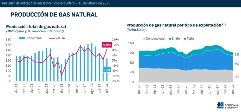 La consultora Economía y Energía (E&E), que encabeza Nicolás Arceo, destaca en un informe que la producción de gas natural en Argentina llegó a los 124 millones de metros cúbicos por día (MMm3/d) en diciembre último, que si bien es una disminución contra noviembre, debido a la menor demanda por el verano, si es un crecimiento interanual del 8,8%.