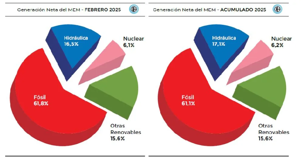 En contraste, las exportaciones cayeron a 39,4 GWh, frente a los 64,8 GWh de febrero de 2024, concentradas principalmente en envíos hacia Uruguay.