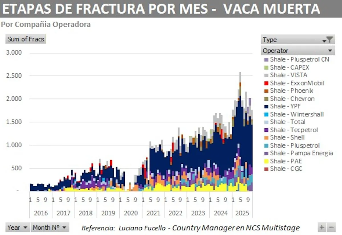 Aun así, el desempeño acumulado del año se mantiene dentro de parámetros históricamente altos. Con once meses medidos, Vaca Muerta ya superó holgadamente las fracturas de 2024 y consolidó un promedio mensual superior a las 1.900 etapas, impulsado por la alta actividad del primer semestre y la consolidación del shale oil neuquino.